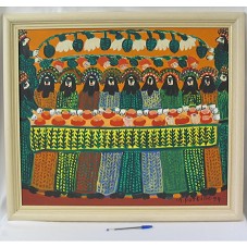 PINTURA SOBRE TELA (60X70 CM) RETRATANDO A SANTA CEIA. PREDOMINA OS TONS DE ALARANJADO, VERDE E AMARELO. NO CANTO INFERIOR DIREITO, ASSINATURA DO ARTISTA 'A.POTEIRO'. MOLDURA (69,5X79,5 CM) EM PÁTINA BEGE, COM FRISO DOURADO.