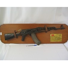 FUZIL AKA 47 (90X26 CM), FIXADO EM BASE DE MADEIRA (105X31 CM). POSSUI UMA PLACA COM O BRASÃO DA REPÚBLICA DE EL SALVADOR E A INSCRIÇÃO 'FUSIL AKA-47 / FABRICADO EN LA REPUBLICA DE COREA DEL NORTE / FUE UTILIZADO POR FUERZAS DEL FRENTE FARABUNDO MARTI PARA LA LIBERACION NACIONAL (FMLN) / EN LA GUERRA DE EL SALVADOR EN ELE FRENTE ORIENTAL ENTRE LOS ANÕS '88 Y '91'. ACONDICIONADO EM UMA CAIXA DE MADEIRA (32X12,5X109 CM).