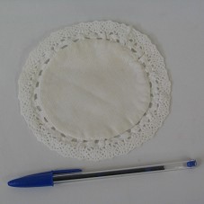 PORTA-COPOS EM TECIDO BRANCO (COM ALGUMAS MANCHAS), FORMATO CIRCULAR, E BICO EM CROCHÊ.