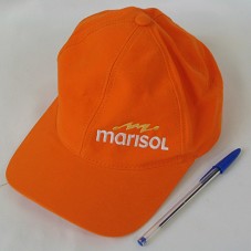 BONÉ EM BRIM LARANJA. NA FRENTE, BORDADO EM BRANCO E AMARELO, 'MARISOL' E LOGOMARCA. ATRÁS, A BANDEIRA DO BRASIL, TAMBÉM BORDADA.