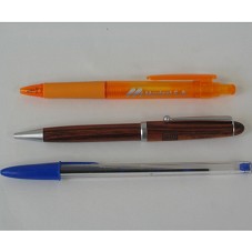 DUAS CANETAS ESFEROGRÁFICAS. A PRIMEIRA, COM CORPO EM MADEIRA E DETALHES EM METAL PRATEADO FOSQUEADO. POSSUI A INSCRIÇÃO 'WEG TRANSFORMANDO ENERGIA EM SOLUÇÕES'. ACONDICIONADA EM ESTOJO CILÍNDRICO DE ACRÍLICO. A SEGUNDA, EM PLÁSTICO LARANJA, COM PARTE EMBORRACHADA, E A INSCRIÇÃO 'MARISOL S.A.' E LOGOMARCA.