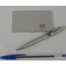 CANETA ESFEROGRÁFICA EM METAL PRATEADO FOSQUEADO, COM A GRAVAÇÃO 'WEG / TRANSFORMANDO ENERGIA EM SOLUÇÕES'. ACOMPANHA UM PORTA-CARTÃO DE VISITAS EM MESMO MATERIAL E COM MESMA INSCRIÇÃO. ACONDICIONADOS EM ESTOJO DE PAPELÃO PRATEADO.