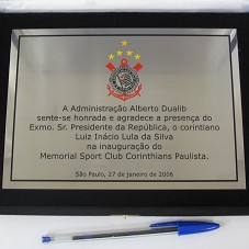 PLACA EM METAL ESCOVADO (20,5X14,5 CM), COM O SÍMBOLO DO 'S.C. CORINTHIANS PAULISTA' E A INSCRIÇÃO 'A ADMINISTRAÇÃO ALBERTO DUALIB SENTE-SE HONRADA E AGRADECE A PRESENÇA DO EXMO. SR. PRESIDENTE DA REPÚBLICA, O CORINTIANO LUIZ INÁCIO LULA DA SILVA NA INAUGURAÇÃO DO MEMORIAL SPORT CLUB CORINTHIANS PAULISTA. SÃO PAULO, 27 DE JANEIRO DE 2006'. ACONDICIONADA EM ESTOJO FORRADO DE VELUDO PRETO.