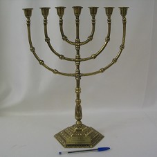 CANDELABRO (32X16X42 CM) EM METAL DOURADO, PARA SETE VELAS. NA BASE, PLACA COM A INSCRIÇÃO 'DIA INTERNACIONAL EM RECORDAÇÃO DAS VÍTIMAS DO HOLOCAUSTO / 27 DE JANEIRO DE 2006 / B'NAI B'RITH DO BRASIL / CONGREGAÇÃO ISRAELITA PAULISTA / SHERIT HAPLEITÁ'.