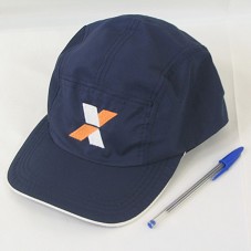 BONÉ EM TACTEL AZUL MARINHO. NA FRENTE, LOGOMARCA DA 'CAIXA ECONÔMICA FEDERAL', BORDADA EM LARANJA E BRANCO. ATRÁS, A INSCRIÇÃO 'CAIXA'.