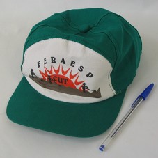 BONÉ EM BRIM VERDE, COM DETALHE BRANCO NA FRENTE E ESTAMPA COM A LOGOMARCA DA 'FERAESP / CUT', DESENHO DE PESSOAS TRABALHANDO A TERRA, AO NASCER DO SOL.