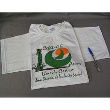 CAMISETA (TAM GG) EM MALHA BRANCA, DE MANGA CURTA. NA FRENTE, ESTAMPA EM VERDE E LARANJA, COM DESENHO DE UM MANDACARU E A INSCRIÇÃO 'CEFET-CE / 10 ANOS / UNED-CEDRO / UMA DÉCADA DE INCLUSÃO SOCIAL'. ATRÁS, 'CURSO PRÓ-MÉDIO / PRÓ-TÉCNICO'. ACOMPANHA CARTÃO DE VISITA DO REMETENTE.