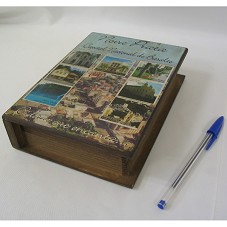 CAIXA/ESTOJO EM MADEIRA (15X21X5 CM). NA TAMPA, FOTOGRAFIAS IMPRESSAS DA CIDADE DE NOVA PRATA, E A INSCRIÇÃO 'NOVA PRATA / CAPITAL NACIONAL DO BASALTO / CIDADE QUE ENCANTA'. NA PARTE INTERNA DA TAMPA, PARTE DE UM MAPA, MOSTRANDO AS RODOVIAS DE ACESSO À CIDADE. CAIXA CONFECCIONADA, COM FORMATO LEMBRANDO UM LIVRO.