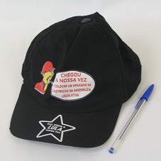 BONÉ EM BRIM PRETO. NA FRENTE, ESTAMPA DE UM OPERÁRIO VESTIDO DE VERMELHO, FALANDO ATRAVÉS DE UM BALÃO, QUE CONTÉM A INSCRIÇÃO 'CHEGOU A NOSSA VEZ DE COLOCAR UM OPERÁRIO DA CONSTRUÇÃO NA ASSEMBLÉIA LEGISLATIVA'. NA ABA, ESTRELA BRANCA COM A INSCRIÇÃO 'EM 2006 É LULA OUTRA VEZ'.