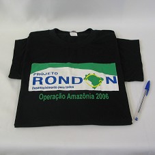 CAMISETA (TAM G) EM MALHA PRETA, DE MANGA CURTA. NA FRENTE, ESTAMPA EM VERDE, BRANCO E AZUL COM A INSCRIÇÃO 'PROJETO RONDON / DESENVOLVIMENTO PARA TODOS / OPERAÇÃO AMAZÔNIA 2006'. ATRÁS, 'VÁ AO ENCONTRO DO SEU POVO. AME-O, APRENDA COM ELE, SIRVA-O, PLANEJE COM ELE. COMECE COM AQUILO QUE ELE SABE, CONSTRUA SOBRE AQUILO QUE ELE TEM. / KWAME KRUMÁ / EQUIPE FESP/UEMG'.