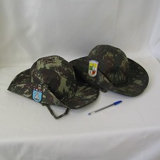 DOIS CHAPÉUS (TAM 59), TIPO AUSTRALIANO, COM TECIDO COM ESTAMPA NAS CORES VERDE E MARROM (COMO CAMUFLAGEM DO EXÉRCITO). EM UM DELES, UM BROCHE EM FORMA DE BRASÃO, COM A INSCRIÇÃO 'BATALHÃO SERIDÓ / CAICÓ-RN'. NO OUTRO, BORDADO EM AZUL, BRANCO E VERMELHO, BRASÃO COM A INSCRIÇÃO '3º B.E. CNST'. CHAPÉUS ACOLCHOADOS, COM DETALHE EM COURO E FELTRO NA PARTE INTERNA.
