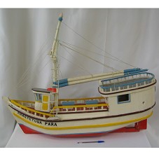 MINIATURA DE BARCO (72x90x20 CM), EM MADEIRA, PINTADO DE BRANCO, VERMELHO E AMARELO. NAS LATERAIS DA PROA, A INSCRIÇÃO 'ABAETETUBA PARÁ'.