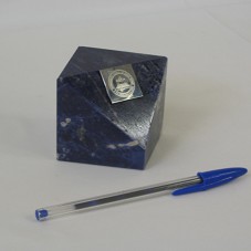 PESO DE PAPEL (6X6X6 CM), EM MÁRMORE AZUL, NO FORMATO DE UM CUBO, COM UMA DA FACES CORTADAS NA DIAGONAL. NESTA, PLACA METÁLICA, COM DESENHO DE UMA FACHADA DE UM PRÉDIO E A INSCRIÇÃO 'UNIVERSIDADE FEDERAL DE MINAS GERAIS / 7 DE SETEMBRO DE 1927'. ACONDICIONADO EM CAIXA DE PRESENTE, COM ESTAMPA NA COR BEGE.