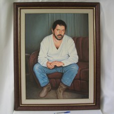 PINTURA SOBRE TELA (81X60 CM), RETRATANDO O PRESIDENTE LUIZ INÁCIO LULA DA SILVA SENTADO EM UM SOFÁ, VESTINDO CALÇA JEANS, CAMISA BRANCA DE MANGAS COMPRIDAS E BOTAS MARROM, COM UM CIGARRO ENTRE OS DEDOS. MOLDURA (101X80 CM) EM MADEIRA ESCURA COM PASSE-PARTOUT CREME. NO CANTO INFERIOR DIREITO, 'HORST SCHNEPPER 97'.