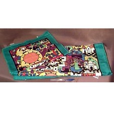 TOALHA DE BANHO E DE ROSTO CONFECCIONADAS EM TECIDO VERDE E TRAZENDO ESTAMPADOS TEMAS ANDINOS.