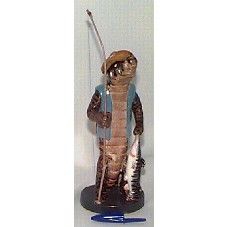 ESCULTURA (21 CM) EM ARGILA, REPRESENTANDO UM JACARÉ TRAJANDO CHAPÉU E COLETE AZUL TRAZENDO, NA MÃO DIREITA, UMA VARA DE PESCAR E, NA MÃO ESQUERDA, UM BAGRE (PEIXE).