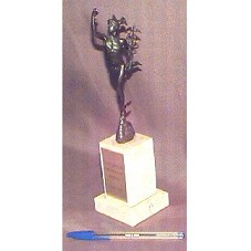 ESCULTURA (28CM) EM BRONZE RETRATANDO O DEUS GREGO HERMES, CHAMADO DE MERCÚRIO NA CULTURA ROMANA, PISANDO COM O PÉ ESQUERDO SOBRE A CABEÇA DE ARGOS. BASE EM MÁRMORE, TRAZENDO UMA PLACA DE METAL DOURADO GRAVADA COM A INSCRIÇÃO 'CONFESERCENTI PROVINCIALE FIRENZE / 23 APRILE 2003'. ACONDICIONADA EM CAIXA DE PAPELÃO DECORADA COM MOTIVOS FLORAIS, ONDE PREDOMINA O AZUL.