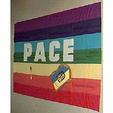 01(UMA) FLÂMULA (29X20CM) NAS CORES AMARELO E AZUL, COM BABADO E ALÇA EM DOURADO, TRAZENDO UM BRASÃO E A INSCRIÇÃO 'PROVINCIA DI MODENA'. 01 (UMA) BANDEIRA (90X137CM) NAS CORES DO ARCO-ÍRIS (LILÁS, AZUL ESCURO, AZUL CLARO, VERDE, AMARELO, LARANJA E VERMELHO), TRAZENDO EM BRANCO A INSCRIÇÃO 'PACE'.