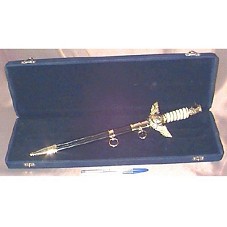 ESPADIM (42CM) COM CABO EM METAL DOURADO E ACRÍLICO BRANCO, REPRESENTANDO AS ASAS SÍMBOLO DA AERONÁUTICA E A CABEÇA DE UMA ÁGUIA, E COM LÂMINA CONFECCIONADA EM METAL PRATEADO, TRAZENDO GRAVADA A INSCRIÇÃO 'PRESIDENTE DA REPÚBLICA / LUIZ INÁCIO LULA DA SILVA'. BAINHA EM ACRÍLICO PRETO E METAL DOURADO, COM DUAS ARGOLAS EM METAL DOURADO. ACONDICIONADO EM ESTOJO AZUL.