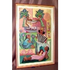 QUADRO (90X60CM) COM PINTURA PRIMITIVISTA QUE RETRATA UMA MULHER, COM UMA POMBA BRANCA NA PERNA ESQUERDA, TOCANDO SANFONA E SENDO ESCUTADA POR UM MENINO, QUE ESTÁ DEITADO NUMA REDE ATADA A DOIS COQUEIROS E QUE AFAGA UM CACHORRO, POR UMA MENINA, QUE TEM UM GATO SENTADO EM SEU VENTRE, E POR OUTRA MENINA, QUE TEM A CABEÇA APOIADA NA MÃO DIREITA. COMPLETAM A CENA O SOL, FLORES E TRÊS CORUJAS. PREDOMINAM TONS DE CORES QUENTES. MOLDURA EM MADEIRA NA COR VINHO, COM FRISOS DOURADOS E PASSE-PARTOUT BRANCO.