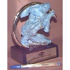 ESCULTURA (18X12X9CM) EM AÇO REPRESENTANDO UM HOMEM, AZUL, AGACHADO DENTRO DE UM SEMI-CÍRCULO DE AÇO PRATEADO. BASE EM MÁRMORE AZUL QUE TRAZ UMA PLACA DOURADA COM A INSCRIÇÃO 'ESCULTOR / PENITHENCIA' E OUTRA, PRATEADA, COM A INSCRIÇÃO 'COMPANHIA SIDERÚRGICA DE TUBARÃO / LIDER MUNDIAL NA PRODUÇÃO DE SEMI-ACABADOS DE AÇO'. ACONDICIONADA EM ESTOJO DE MADEIRA.