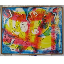 PINTURA SOBRE TELA (99,5X129,5 CM) MOSTRANDO ROSTOS E PARTES DO CORPO HUMANO ESTILIZADOS. PREDOMINAM OS TONS DE VERDE, AZUL, AMARELO E VERMELHO. NO CANTO INFERIOR DIREITO, A ASSINATURA DO ARTISTA (NÃO IDENTIFICADA). MOLDURA EM MADEIRA CLARA (103X133 CM).