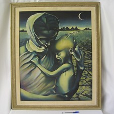 PINTURA SOBRE TELA (80X63,5 CM), EM TONS DE AZUL ESCURO, VERDE, COM BRILHOS EM AMARELO. RETRATA UMA MÃE SEGURANDO SEU FILHO QUE CHORA, APARENTEMENTE POR FOME, POR ESTAR SUBNUTRIDO. AO FUNDO, PAISAGEM COM ROCHAS AO FUNDO, NUMA NOITE, COM CHÃO DE SERTÃO, ONDE AS RACHADURAS SE ENCONTRAM COM A CABEÇA DA CRIANÇA. NO CANTO INFERIOR DIREITO, ASSINATURA DA ARTISTA, 'STELLA MARTINS 84'. ATRÁS, PAPEL FIXADO COM BREVE CURRÍCULO DA AUTORA, DATADO DE 24/08/1984. MOLDURA EM MADEIRA PATINADA (90,5X86,5 CM) EM TONS DE DOURADO, COM FRISO NA MESMA COR E PASSE-PARTOUT CREME.