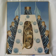 PINTURA SOBRE TELA (91X73 CM) SOBRE FUNDO AZUL. MOSTRA UMA MESA DE JANTAR, COM NOVE HOMENS SENTADOS, TODOS SEM FACE. OS PRATOS DE CADA UM ESTÃO VAZIOS; E COMO PRATO PRINCIPAL, APRESENTA PESSOAS SUBNUTRIDAS COM FOME. NO CANTO INFERIOR DIREITO, ASSINATURA DA ARTISTA 'DENIZI'. MOLDURA EM RIPA DE MADEIRA (93X74,5 CM).