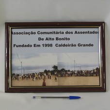 QUADRO (23X33 CM) COM MOLDURA EM MADEIRA LAMINADA DE MARROM, COM FRISO DOURADO. POSSUI DUAS FOTOGRAFIAS IMPRESSAS, MOSTRANDO VÁRIAS PESSOAS EM UM VILAREJO, E A INSCRIÇÃO 'ASSOCIAÇÃO COMUNITÁRIA DOS ASSENTADOS DE ALTO BONITO / FUNDADO EM 1998 / CALDEIRÃO GRANDE'.