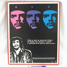 QUADRO (52X42,5 CM), COM GRAVURAS EM NEGATIVO, RETRATANDO CHE GUEVARA, CONTENDO AS INSCRIÇÕES 'CUBA TE SABE DE MEMORIA. ROSTRO DE BARAS QUE CLAREAN. Y MARFIL Y ACEITUNA EN LA PIEL DE SANTO JOVEN...SIN DUDA ALGUNA, EL MAS EXTRAORDINARIO DE NUESTROS COMPAÑEROS DE REVOLUCION.'