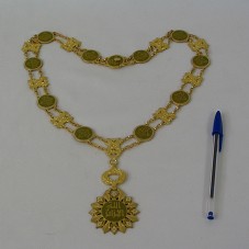 ORDEM DO MÉRITO NACIONAL, NO GRAU 'DIGNITÉ ATHIR', COMPOSTA POR COLAR EM METAL DOURADO FOSQUEADO, COM MEDALHAS EM MESMO MATERIAL, TENDO O CENTRO EM DETALHES VERDES COM INSCRIÇÕES ÁRABES. POSSUI INSÍGNIA PRESA A ELE, CIRCULAR, COM RAIOS EM LOSANGO, COM CENTRO NO MESMO ESTILO DAS MEDALHAS. ACONDICIONADO EM ESTOJO FORRADO DE NAPA VINHO, COM DETALHES DOURADOS NA TAMPA.
