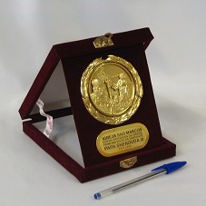 MEDALHA (7X7 CM) CIRCULAR, EM METAL PINTADO DE DOURADO. AO FUNDO, DESENHO DE UMA IGREJA, E, EM PRIMEIRO PLANO E ALTO RELEVO, A FIGURA DO PAPA SHENOUDA III E DE OUTRO HOMEM ESCREVENDO EM UM LIVRO. AO SEU REDOR FOLHAS DE LOURO (POSSUI RACHADURAS E PINTURA DESCASCADA). ABAIXO DA MEDALHA, PLACA COM A INSCRIÇÃO 'IGREJA SAO MARCOS / COPTA ORTODOXA DO BRASIL / PRIMEIRA VISITA DA SANTIDADE PAPA SHENOUDA III / FEV. 2006'. AMBOS FIXADOS EM BASE REVESTIDA DE VELUDO VINHO; E ESTA, NA CAIXA QUE OS ACONDICIONA.