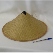 CHAPÉU (37X37X15 CM) DE PALHA, NO FORMATO DE UM CONE, COM A PARTE SUPERIOR ARREMATADA EM NAPA PRETA. INTERNAMENTE, 'AURÉOLA' ONDE SE FIXA A CABEÇA E FITA EM BORRACHA PRETA. LEMBRA OS CHAPÉUS USADOS POR CHINESES QUE LIDAM NA AGRICULTURA.