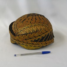 CHAPÉU EM TECIDO PRETO, COM ESTAMPA EM MARROM E DETALHES EM PURPURINA DOURADA. POSSUI ESTRUTURA MODELADA EM PAPEL. A FRENTE LEMBRA OS TURBANTES ÁRABES, PORÉM, REMETE À CULTURA AFRICANA. ACONDICIONADO EM CAIXA DE PAPELÃO FORRADA DE TECIDO COM ESTAMPA NAS CORES MARROM E BEGE.