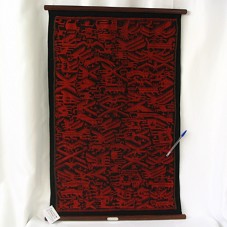 PAINEL EM TAPEÇARIA (88X54 CM), EM TONS DE VERMELHO E PRETO, COM DESENHOS GEOMÉTRICOS DE FIGURAS DE ANIMAIS. COSTURADO SOBRE BASE DE TECIDO PRETO (92X60 CM), PRESA A RIPAS DE MADEIRA NAS EXTREMIDADES, COM ARGOLAS NA PARTE SUPERIOR PARA COLOCAÇÃO EM PAREDE. NA PARTE INFERIOR, PLACA METÁLICA COM A INSCRIÇÃO 'PRESIDENCIA DE LA REPÚBLICA DE BOLIVIA'. POSSUI ETIQUETA COM INFORMAÇÕES SOBRE A PEÇA: 'PRODUCT AXSU / PRODUCED BY DELIA CARRILLO / MADE IN THE COMMUNITY JAPON / MATERIAL HILO OUJA / CODE 4763/EA/04 / HECHO A MANO / CHUQUISACA - BOLIVIA'. ACONDICIONADA EM SACO DE VELUDO VERDE ESCURO.