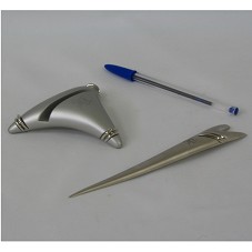 PORTA-CARTÃO (10X10X10X2,5 CM) DE MESA, EM FORMATO TRIANGULAR COM BORDAS ARREDONDADAS; E ABRIDOR DE CARTAS (17,5X3 CM), AMBOS EM AÇO INOX FOSQUEADO, COM DETALHES POLIDOS. POSSUEM A INSCRIÇÃO 'SADC'. ACONDICIONADOS EM CAIXA DE PAPELÃO AZUL MARINHO, COM CINTA BRANCA.