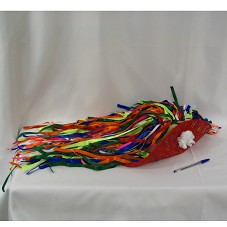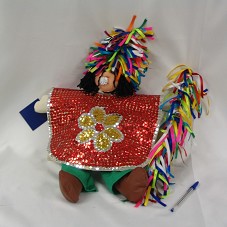 BONECO DE PANO (53X43 CM), VESTINDO CALÇA EM MALHA VERDE, SAPATOS EM NAPA MARROM, CABELOS EM LÃ PRETA, COM CHAPÉU EM FITAS COLORIDAS DE CETIM E UMA BLUSA ARREMATADA COM LANTEJOULAS VERMELHAS, PRATAS E AMARELAS. SEGURA UM BASTÃO ENFEITADO COM FITAS DE CETIM. FIGURA ESTILIZADA DO DANÇARINO DE MARACATU. NA LATERAL, ETIQUETA 'ATELIER DE ARTESANATO / MARACATU MODAS' PRESA, COM BREVE DESCRIÇÃO DA PROPOSTA DO TRABALHO.