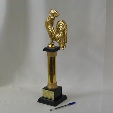 TROFÉU (48X11X11 CM- MEDIDAS TOTAIS) EM METAL DOURADO, FIGURA DE UM GALO EM CIMA DE UM PEDESTAL, COM COLUNA EM METAL DOURADO POLIDO, E EXTREMIDADES FOSQUEADAS. BASE EM MADEIRA PINTADA DE PRETO. NESTA, PLACA COM A INSCRIÇÃO 'AO PRESIDENTE DO POVO, LUIZ INÁCIO LULA DA SILVA, PELA POPULARIEDADE E NORDESTINIDADE, A SINCERA HOMENAGEM DO MAIOR BLOCO CARNAVALESCO DO MUNDO, O GALO DA MADRUGADA / MARÇO/2003'.