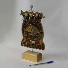 ESTANDARTE (23X17 CM) EM TECIDO MARROM, COM UMA FIGURA DE UM GALO NA PARTE CENTRAL, E TRÊS MÁSCARAS NA PARTE SUPERIOR. POSSUI A INSCRIÇÃO 'CLUBE DAS MASCARAS / O GALO DA MADRUGADA / 1978'. PRESO À HASTE METÁLICA (29X18 CM). ESTA, FIXADA EM BASE DE MADEIRA (11X6X4,5 CM) COM UMA PLACA NA PARTE FRONTAL, ONDE HÁ A INSCRIÇÃO 'AO PRESIDENTE DO POVO, LUIZ INÁCIO LULA DA SILVA, PELA POPULARIEDADE E NORDESTINIDADE, A SINCERA HOMENAGEM DO MAIOR BLOCO CARNAVALESCO DO MUNDO, O GALO DA MADRUGADA / RECIFE, 21 DE FEVEREIRO DE 2006'.