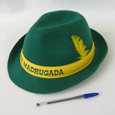 DOIS CHAPÉUS (TAM 59), TIPO ALEMÃO, EM FELTRO VERDE, COM FITA AMARELA CONTENDO A INSCRIÇÃO 'GALO DA MADRUGADA', E UMA PENA AMARELA NA LATERAL.
