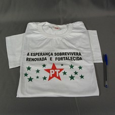 CAMISETA (TAM G) EM MALHA BRANCA, DE MANGA CURTA. NA FRENTE, ESTAMPA COM ESTRELAS VERDES, TENDO NO CENTRO A ESTRELA VERMELHA DO 'PT' E A INSCRIÇÃO 'A ESPERANÇA SOBREVIVERÁ RENOVADA E FORTALECIDA'.