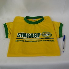 CAMISETA (TAM G) EM MALHA AMARELA, COM DETALHES VERDES NAS MANGAS E GOLA. NA FRENTE, ESTAMPA EM VERDE E BRANCO, COM A INSCRIÇÃO 'SINGASP / SINDICATO DOS GARIMPEIROS DE SERRA PELADA'. ATRÁS, MESMA ESTAMPA.