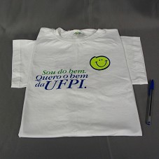 CAMISETA (TAM GG) EM MALHA BRANCA, DE MANGA CURTA. NA FRENTE, ESTAMPA EM VERDE E AZUL, COM A INSCRIÇÃO 'SOU DO BEM / QUERO O BEM DA UFPI' E DESENHO DE UM ROSTO ESTILIZADO, SORRINDO. ATRÁS, 'UFPI / GESTÃO 2004/2008 / EDUCAÇÃO CIÊNCIA ARTE INCLUSÃO SOCIAL'.