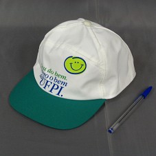 BONÉ EM TECIDO BRANCO, COM A ABA VERDE. NA FRENTE, ESTAMPA COM A INSCRIÇÃO 'SOU DO BEM / QUERO O BEM DA UFPI' E DESENHO DE UM ROSTO ESTILIZADO, SORRINDO.