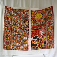 PAINEL EM TECIDO BRANCO (151X137 CM), COM ESTAMPA EM TONS DE VERMELHO, AMARELO E PRETO, COM MOTIVOS AFRICANOS E FOTOGRAFIAS DE PERSONAGENS ILUSTRES, COMO NELSON MANDELA, THABO MBEKI, GILBERTO GIL, ETC. POSSUI A INSCRIÇÃO 'ILÊ AIYÊ - O NEGRO E O PODER 2006 / SE O PODER É BOM, EU TAMBÉM QUERO O PODER'.