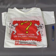 DUAS CAMISETAS IGUAIS (TAM M E G) EM MALHA BRANCA, DE MANGA CURTA. NA FRENTE, ESTAMPA DE UM QUADRADO VERMELHO, COM UM MÉDICO E UMA ENFERMEIRA GRITANDO NUM MEGAFONE, COM UM PONTO DE INTERROGAÇÃO ENTRE ELES, E A INSCRIÇÃO 'TRABALHE COM UM SALÁRIO DESSES! / SINDSAÚDE / PERNAMBUCO / FILIADO A CUT/CNTSS'. ATRÁS, 'É PRECISO QUE TODOS SAIBAM QUANTO O GOVERNO ESTADUAL PAGA AOS TRABALHADORES EM SAÚDE: NÍVEL ELEMENTAR R$ 174,00 / NÍVEL MÉDIO R$ 201,00 / NÍVEL SUPERIOR R$ 542,00'.