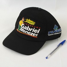 BONÉ EM BRIM PRETO. NA FRENTE, ESTAMPA DE UM HOMEM COM CHAPÉU DE CANGACEIRO E A INSCRIÇÃO 'UH, VENENO! / PROGRAMA GABRIEL MENEZES'. NAS LATERAIS, 'JUAGRO / PRODUTOS E MÁQUINAS AGRICOLAS'. ATRÁS, 'P 104,9 / PETROLINA FM'.