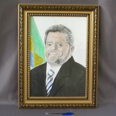 DESENHO (40,5X28 CM) SOBRE PAPEL CANSON BRANCO, CONFECCIONADO COM CRAYON E LÁPIS DE COR, RETRATANDO O BUSTO DO PRESIDENTE LULA, EM PRIMEIRO PLANO, E A BANDEIRA DO BRASIL, EM SEGUNDO. NA PARTE INFERIOR DIREITA, A INSCRIÇÃO 'ARTE: CLEBSON / DATA: 18/02/06'. MOLDURA (52X40 CM) EM MADEIRA LAMINADA EM DOURADO, COM DETALHES EM ALTO RELEVO. ATRÁS, CARIMBO COM A INSCRIÇÃO 'A OVELHA NEGRA TELAS E MOLDURAS / FONE 521-3472 / ARAPIRACA-AL'.