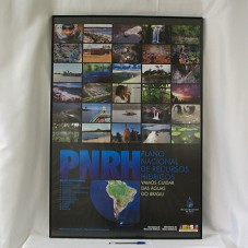 CARTAZ (92X62 CM) EM FUNDO PRETO, COM VÁRIAS FOTOGRAFIAS MOSTRANDO A ÁGUA E SUAS DIVERSAS FUNÇÕES (RIO, HIDRELÉTRICA, PRAIA, LÍQUIDO PARA BEBER, ETC). POSSUI A INSCRIÇÃO 'PNRH - PLANO NACIONAL DE RECURSOS HÍDRICOS / VAMOS CUIDAR DAS ÁGUAS DO BRASIL' E UM MAPA DO BRASIL COM AS 'REGIÕES HIDROGRÁFICAS' IDENTIFICADAS. NA PARTE INFERIOR, UMA GOTA D'ÁGUA COM A INSCRIÇÃO 'DÉCADA BRASILEIRA DA ÁGUA 2005-2015'; 'SECRETARIA DE RECURSOS HÍDRICOS'; 'MINISTÉRIO DO MEIO AMBIENTE' E LOGOMARCA DO GOVERNO FEDERAL. POSSUI MOLDURA(94X64 CM) EM ALUMÍNIO PINTADO DE PRETO E TAMPO DE VIDRO.