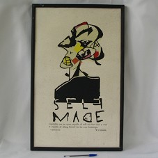 QUADRO (68X43,5 CM), CONTENDO PINTURA IMPRESSA, FIGURA DE UMA HOMEM ESTILIZADO E A INSCRIÇÃO 'SELF MADE'. CONTÉM TAMBÉM A INSCRIÇÃO 'CAPITALISTS ARE NO MORE CAPABLE OF SELF-SACRIFICE THAN A MAN IS CAPABLE OF LIFTING HIMSELF BY HIS OWN BOOTSTRAPS. / V.I.LENIN'. NA PARTE ESQUERDA 'D.MINKLER 1984'. MOLDURA EM MADEIRA PINTADA DE PRETO.